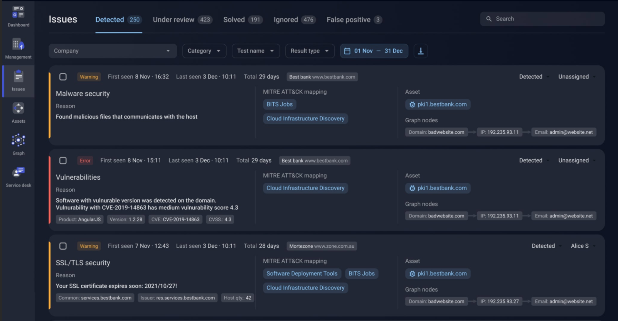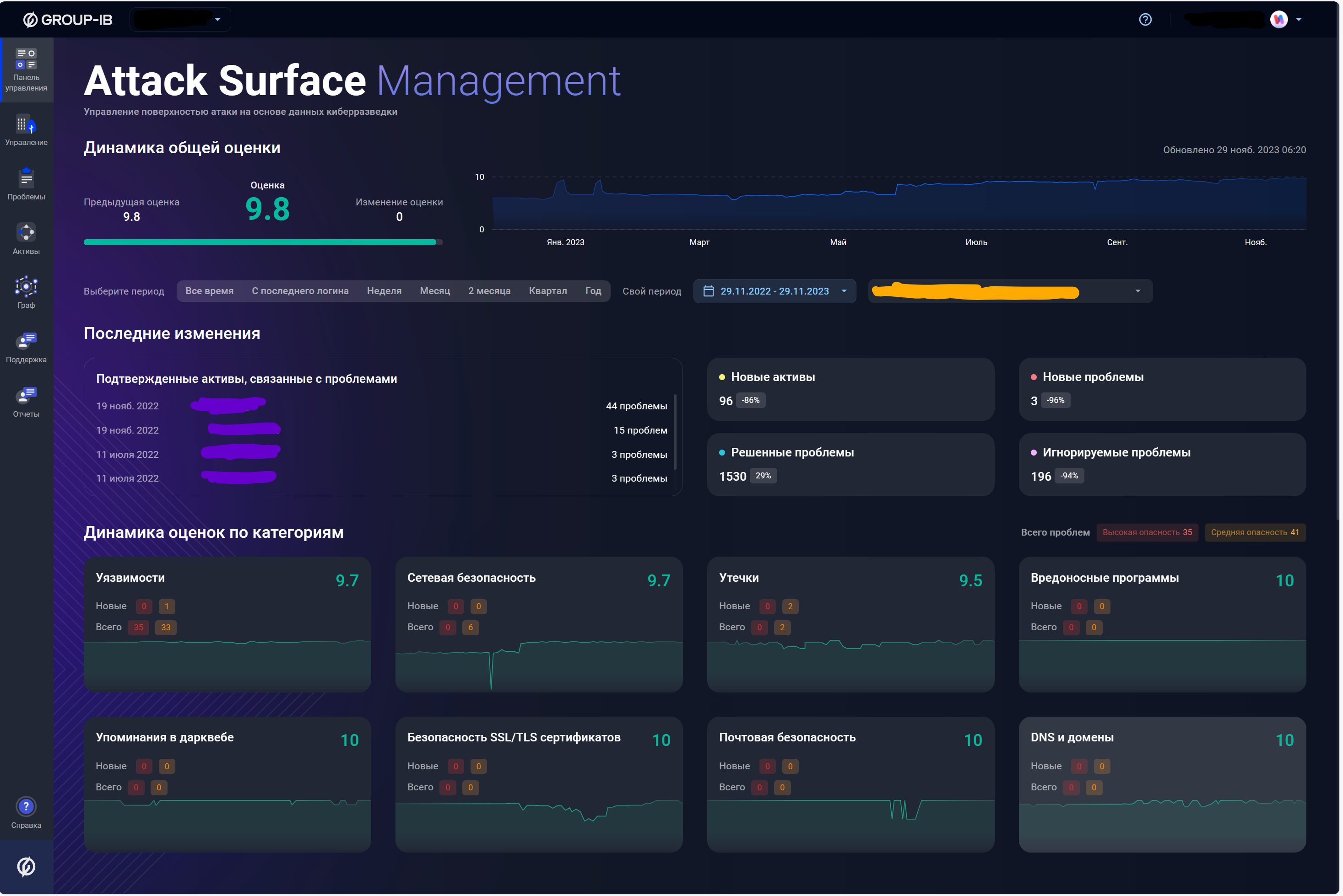 Сканирование повторяется в автоматическом режиме каждые сутки, изменения отражаются на дашборде: новые, решенные, игнорируемые проблемы, новые активы и пр.