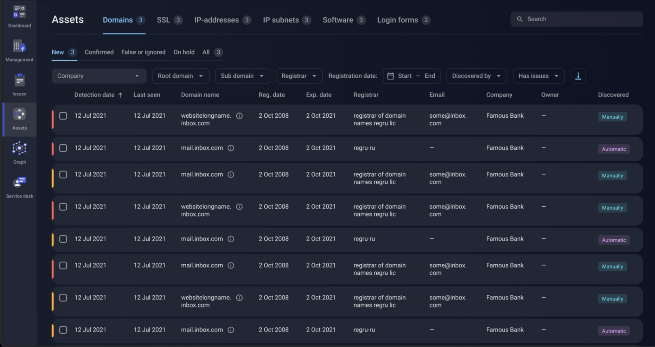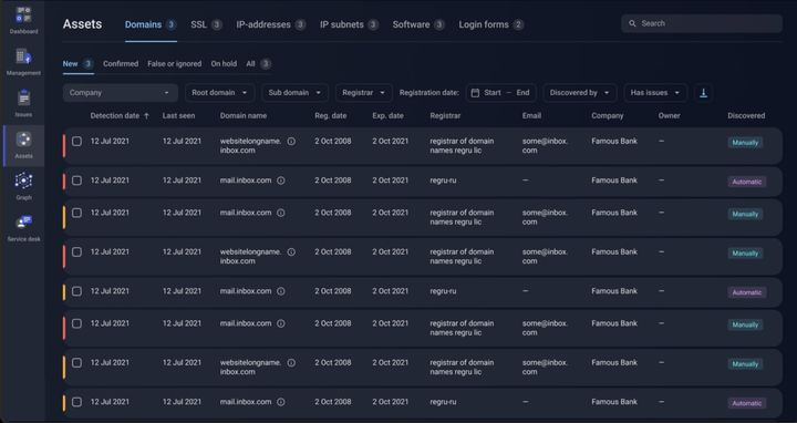 Все обнаруженные активы организации можно увидеть во вкладке «Активы». Пользователь может подтвердить или игнорировать добавленные активы. Это обеспечивает полную видимость цифрового отпечатка организации и регулярную инвентаризацию доступных извне активов.
