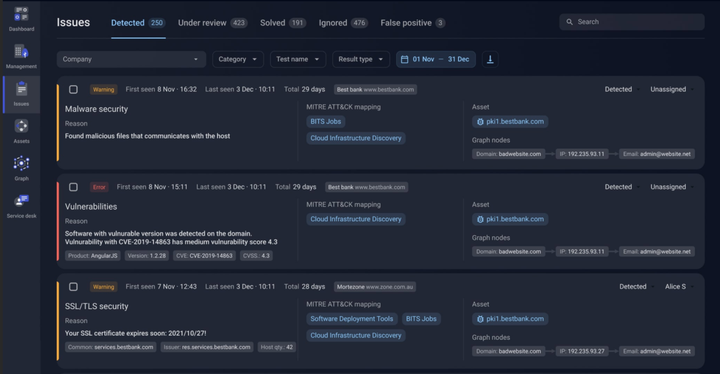 Все обнаруженные уязвимости ИТ-ресурсов организации можно найти в разделе «Проблемы». Выявленным проблемам могут быть присвоены следующие статусы: «В работе», «Решенные», «Игнорируемые» или «Ложное-позитивные». В этом разделе вы также можете создавать задачи для своей команды и оптимизировать действия по устранению последствий.